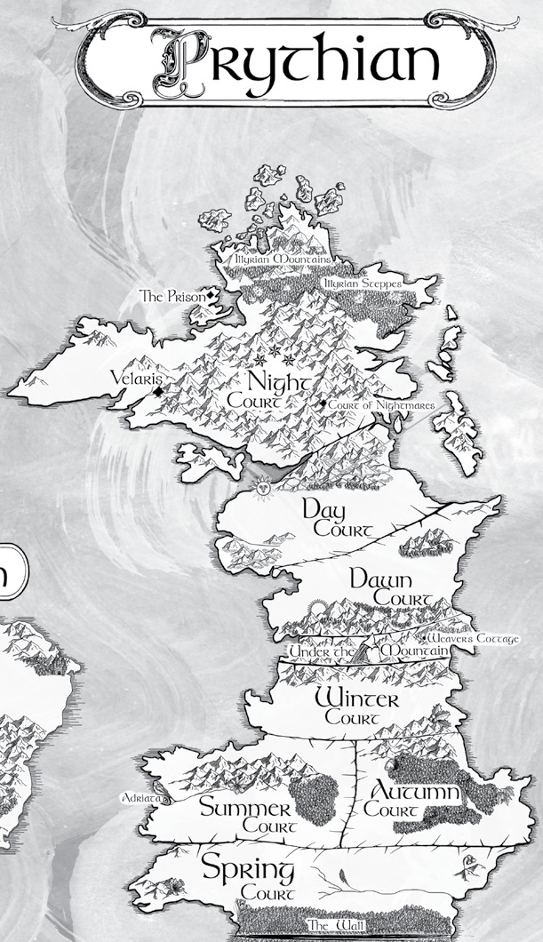Prythian is composed of seven separately ruled lands called "courts" consisting of four seasonal courts: the Summer, Autumn, Winter, and Spring Courts, and three solar courts: the Night, the Day, and Dawn Courts. It also borders the Mortal Lands to the south, with the only separation between them being the Wall, and lies east of the Kingdom of Hybern.
