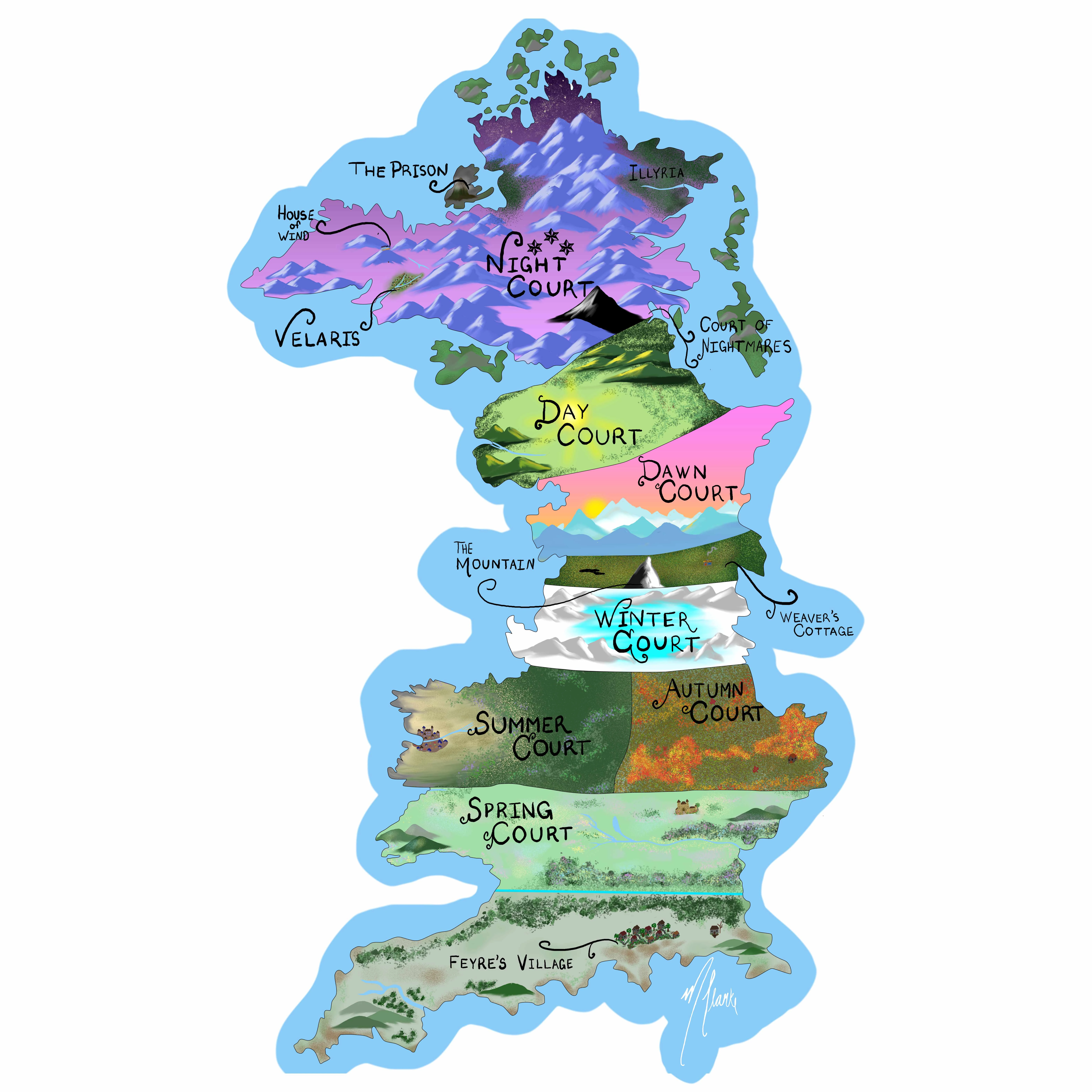 North of the seasonal courts resides the three solar courts: the Night Court, the Day Court, and the Dawn Court. The Dawn Court resides north of the Winter Court and is known for its mountain palace in the clouds. Continuing North of the Dawn Court is the Day Court, the court said to contain much of Prythian's history within its abundance of libraries. Occupying the land to the far north is the Night Court, the largest and most feared of all of the courts.